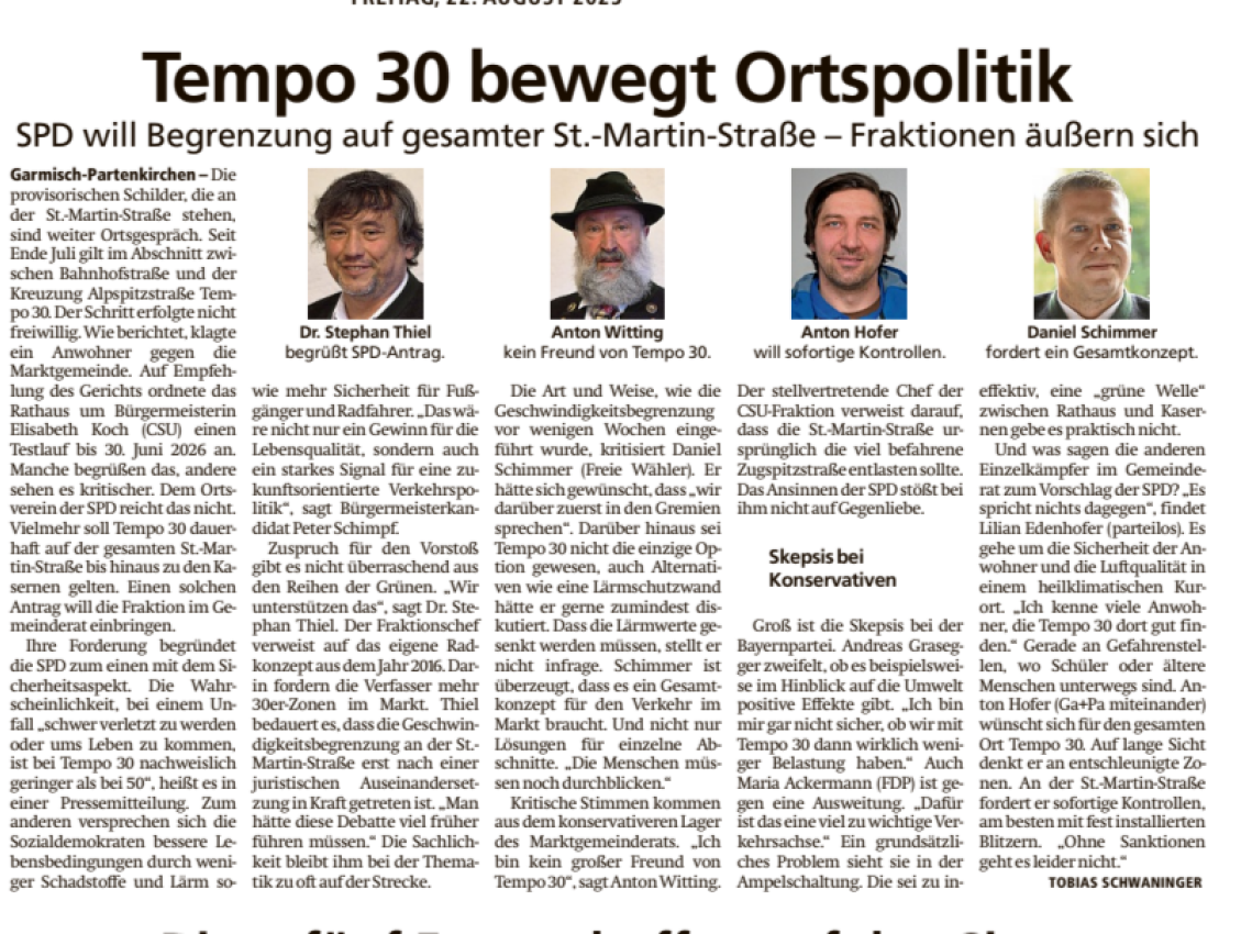 Die SPD Garmisch-Partenkirchen fordert Tempo 30 auf der gesamten St.-Martin-Straße, um den Straßenverkehr sicherer für Fußgänger und Radfahrer zu machen.